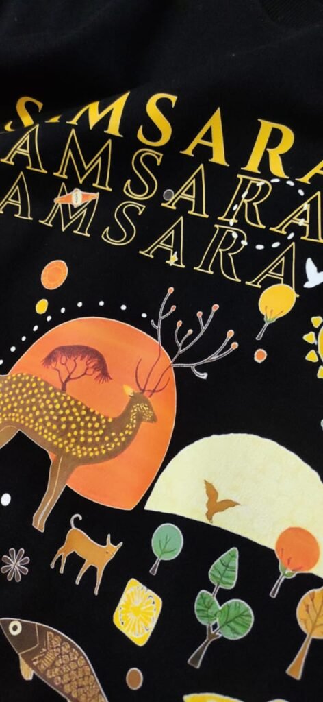 Samsara Flow is more than a design; it’s a reminder of how life moves in circles — rivers feed the land, forests shelter life, and the sky holds it all together. Inspired by Gond artistry, this piece flows through earth, water, and sky, where deer, fish, trees, and the sun all become part of one rhythm.